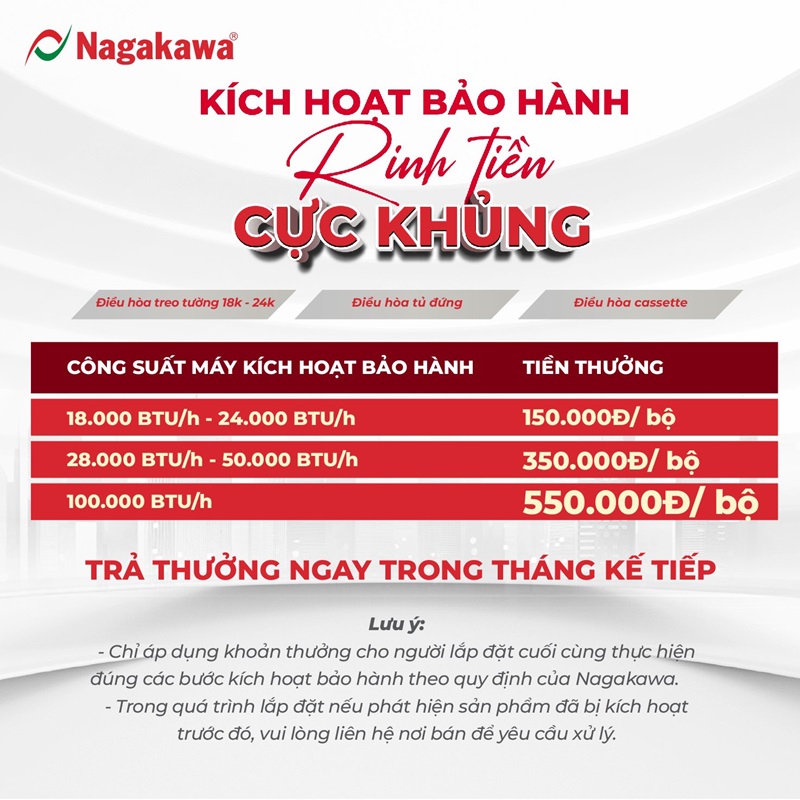 Từ ngày 15/04 đến 30/06/2024, Nagakawa triển khai chương trình "Kích hoạt bảo hành - Rinh tiền cực khủng" dành cho khách hang, thợ lắp đặt điều hòa treo tường công suất 18.000-24.000 BTU, điều hòa tủ đứng và điều hòa cassette.