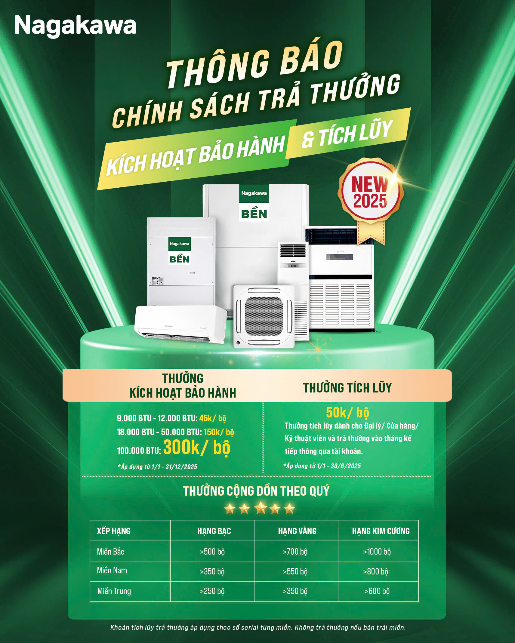 Từ ngày 01/01/2025 đến hết ngày 31/12/2025 khi kích hoạt chương trình bảo hành sản phẩm điều hòa Nagakawa, khách hàng sẽ nhận được các mức thưởng hấp dẫn, cụ thể: