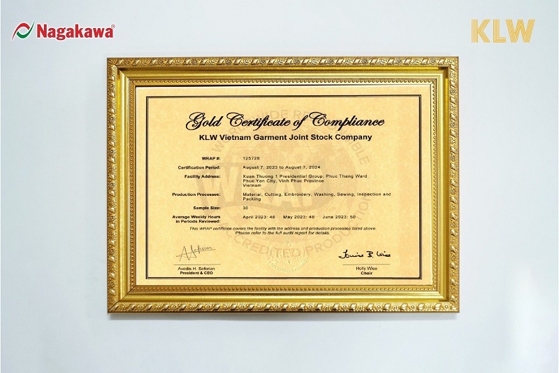 Ngày 7/8/2023, KLW Việt Nam đạt được chứng nhận WRAP cấp độ Vàng, tạo nên một dấu mốc mới trong chặng đường xây dựng thương hiệu danh giá có trách nhiệm và góp phần vào sự phát triển bền vững của ngành công nghiệp may mặc Việt Nam.