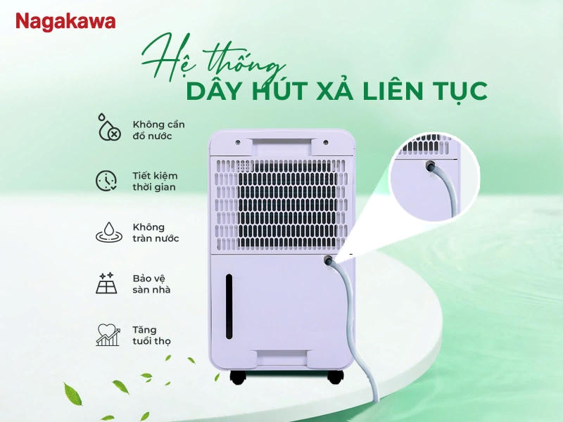 Máy hút ẩm Nagakawa được tích hợp hệ thống dây hút xả liên tục, cho phép máy hoạt động liên tục mà không cần dừng lại đổ nước. Tính năng này không chỉ giúp bạn tiết kiệm thời gian và công sức mà còn hạn chế tình trạng tràn nước, bảo vệ sàn nhà và tăng tuổi thọ cho thiết bị.