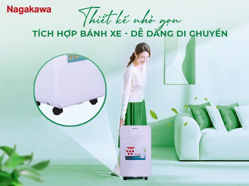 Nhờ thiết kế nhỏ gọn, tích hợp tay xách và bánh xe, bạn có thể dễ dàng di chuyển máy hút ẩm Nagakawa đến bất cứ vị trí nào trong nhà.