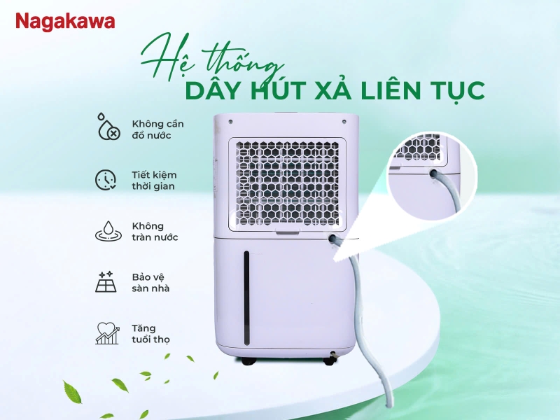 Máy hút ẩm Nagakawa NAD8556 được trang bị hệ thống dây hút xả liên tục, cho phép máy hoạt động liên tục mà không cần dừng lại đổ nước. Tính năng này không chỉ giúp bạn tiết kiệm thời gian và công sức mà còn hạn chế tình trạng tràn nước, bảo vệ sàn nhà và tăng tuổi thọ cho thiết bị.