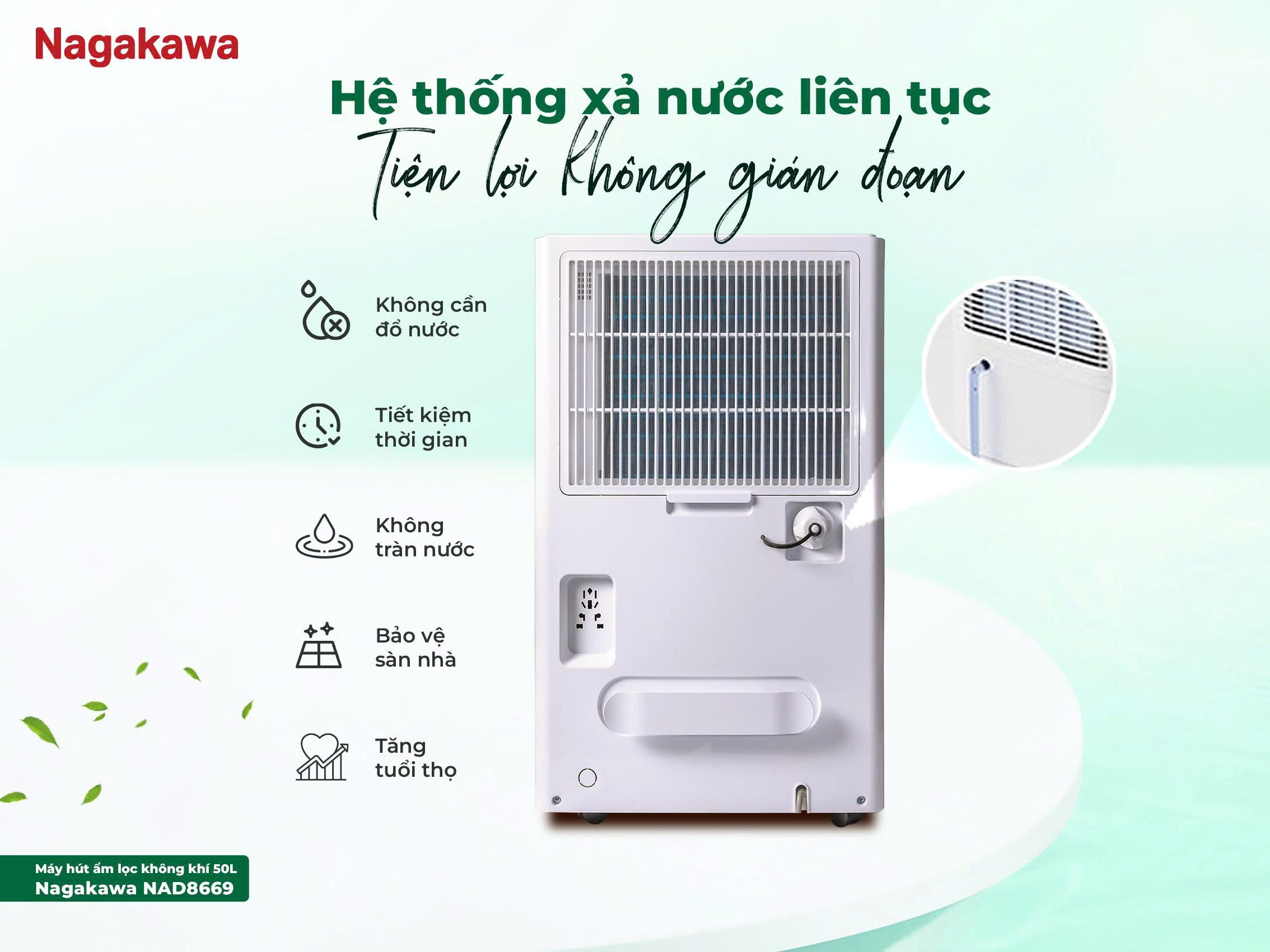 Một trong những điểm cộng lớn của Máy hút ẩm lọc không khí 50L Nagakawa NAD8669 chính là hệ thống dây xả liên tục. Với tính năng này, máy có thể hoạt động không ngừng nghỉ trong thời gian dài mà không cần bạn phải dừng lại để đổ nước. Không chỉ tiết kiệm thời gian, tính năng này còn hạn chế tình trạng tràn bình, bảo vệ sàn nhà khỏi ẩm ướt và hư hại.