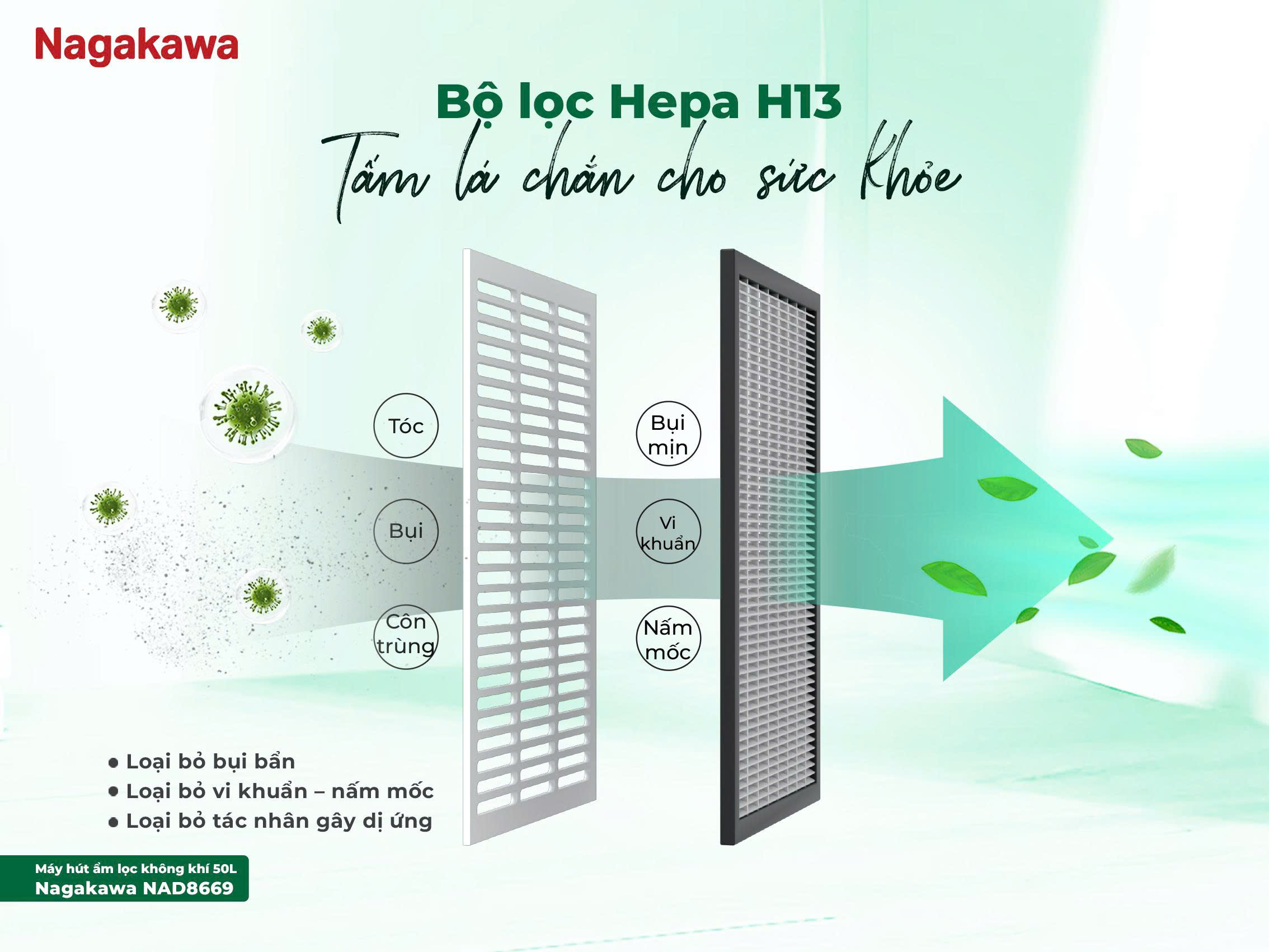 Máy hút ẩm lọc không khí 50L Nagakawa NAD8669 không chỉ hút ẩm mà còn tích hợp bộ lọc HEPA H13 hiện đại, có khả năng giữ lại tới 99,97% hạt bụi mịn PM2.5, vi khuẩn và nấm mốc trong không khí. Điều này giúp giảm nguy cơ dị ứng, bảo vệ hệ hô hấp và tạo bầu không khí trong lành, đặc biệt quan trọng đối với gia đình có trẻ nhỏ và người lớn tuổi.
