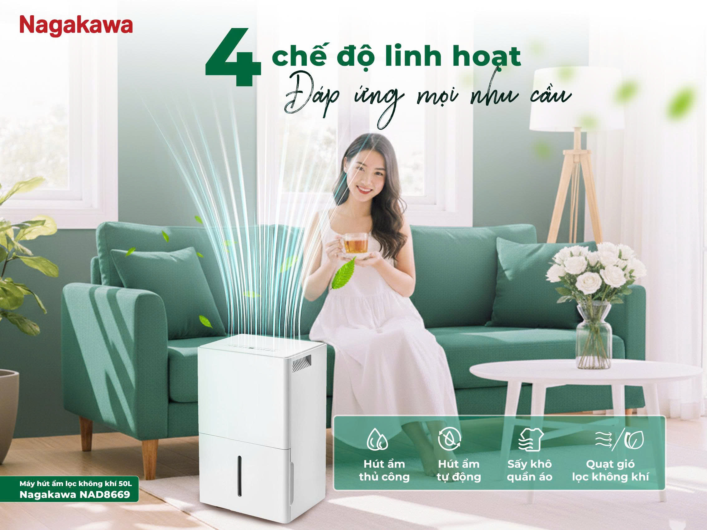 Máy hút ẩm lọc không khí 50L Nagakawa NAD8669 mang đến sự chủ động tuyệt đối với 4 chế độ: hút ẩm thủ công, hút ẩm tự động, sấy khô quần áo và quạt gió lọc không khí. Mỗi chế độ được tối ưu cho từng tình huống: từ việc giữ độ ẩm ổn định, bảo vệ nội thất, giúp quần áo khô nhanh trong ngày mưa, cho đến cải thiện chất lượng không khí hàng ngày.