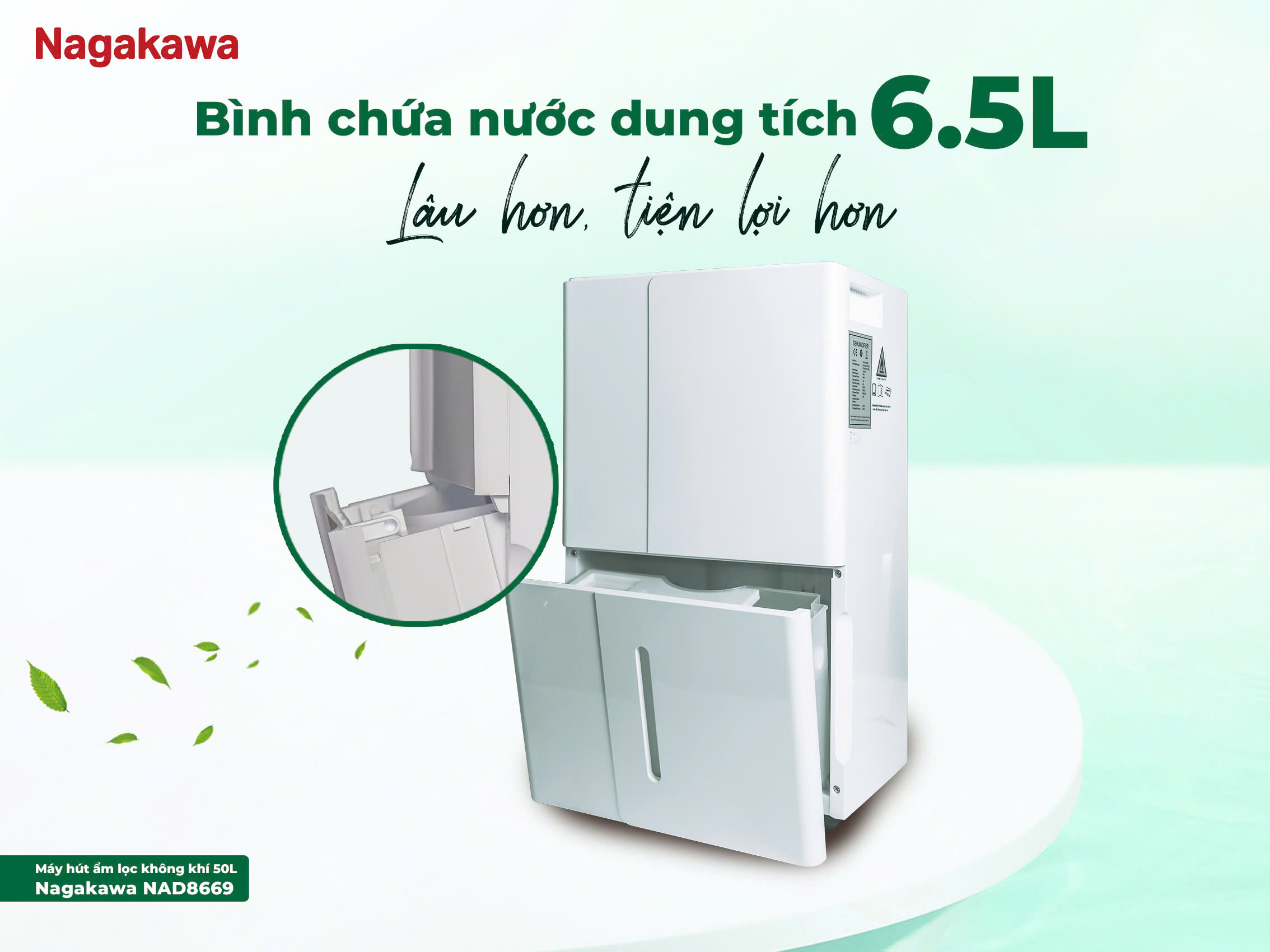 Trong trường hợp bạn không sử dụng dây xả, Máy hút ẩm lọc không khí 50L Nagakawa NAD8669 vẫn mang đến sự tiện lợi với bình chứa dung tích lớn tới 6.5 lít. Nhờ dung tích này, máy có thể hoạt động nhiều giờ liền trước khi cần đổ nước, rất phù hợp cho gia đình bận rộn hoặc khi sử dụng trong không gian rộng.