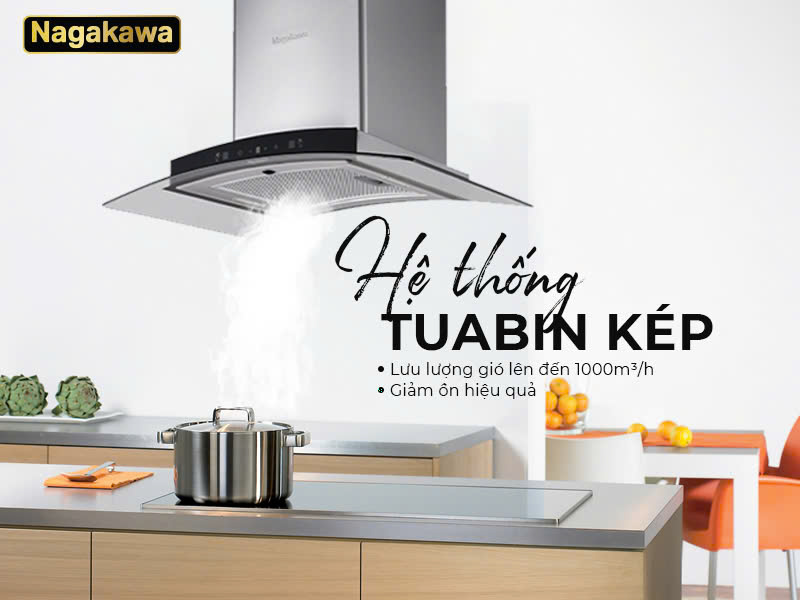 Với lưu lượng gió lớn lên đến 1000m³/h, máy hút mùi Nagakawa được trang bị động cơ tuabin kép, giúp giảm độ ồn hiệu quả và xử lý mùi tốt hơn.