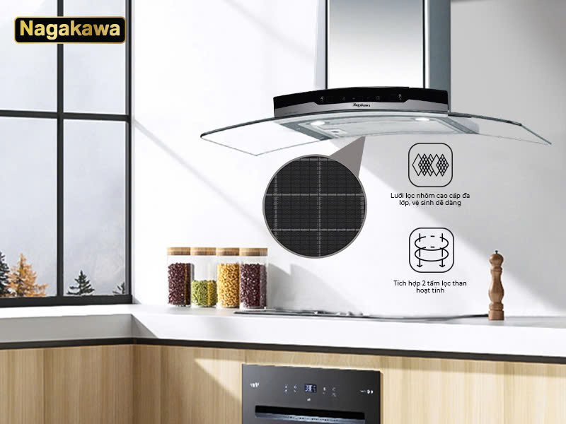 Hệ thống lọc than hoạt tính cao cấp Nagakawa hấp thu cặn bẩn, khói bếp,... đồng thời khử mùi hoàn toàn theo tiêu chuẩn của máy lọc không khí, giúp không gian bếp luôn thoáng mát, trong lành để mỗi phút giây của gia đình bạn trong bếp đều thư thái, dễ chịu.