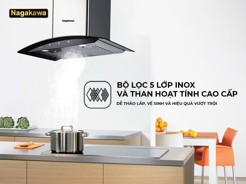 Hệ thống lọc than hoạt tính cao cấp Nagakawa tạo cơ chế trao đổi khí mạnh mẽ, hấp thu dầu mỡ, khói bếp,... đồng thời khử mùi hoàn toàn theo tiêu chuẩn của máy lọc không khí, giúp không gian bếp luôn thoáng mát, trong lành. Bên cạnh đó, khay hứng mỡ thông minh, loại bỏ dầu mỡ thừa dễ dàng, để mỗi phút giây của gia đình bạn trong bếp đều thư thái, dễ chịu.