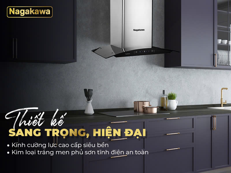 Máy hút mùi cao cấp Nagakawa NAG1855-70CM làm từ kính cường lực cao cấp siêu bền cùng chất liệu kim loại tráng men phủ lớp sơn tĩnh điện đảm bảo an toàn cho người sử dụng.