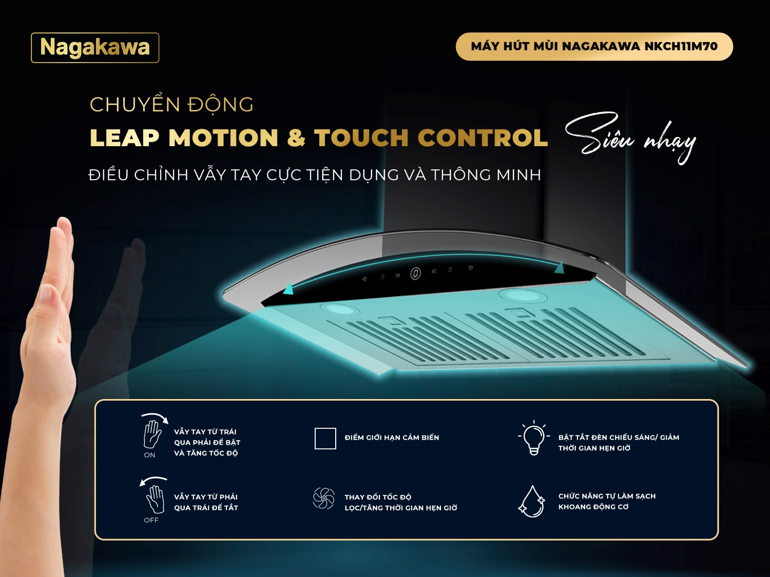 Máy hút mùi Nagakawa NKCH11M70 được trang bị Leap Motion & Touch Control mang đến trải nghiệm điều khiển không chạm tiện lợi. Bạn có thể sử dụng cử chỉ tay hoặc cảm ứng để thao tác nhanh chóng, giúp giữ bề mặt sạch sẽ mà không cần chạm trực tiếp.