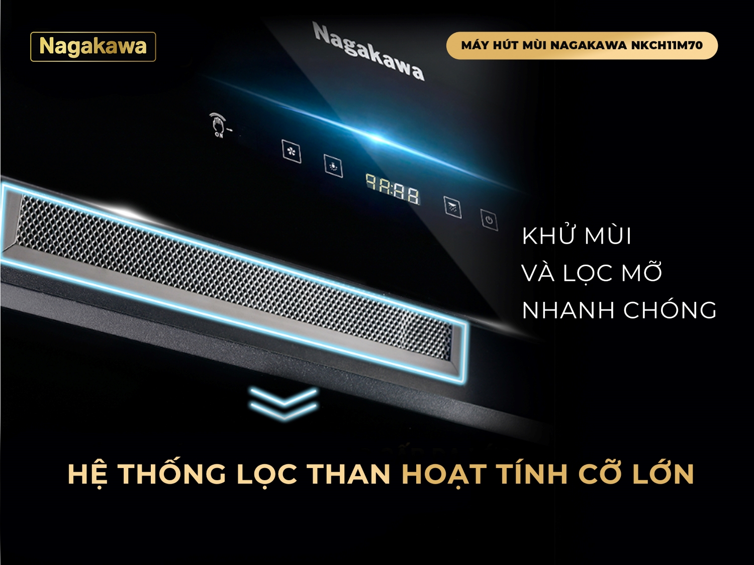 Mùi thức ăn ám lâu nhưng nhờ máy hút mùi Nagakawa NKCH11M70 sẽ không còn mùi khiến không gian trong bếp thoải mái và dễ chịu. Vì có hai tấm lọc than hoạt tính cỡ lớn giúp hấp thụ khói dầu và hạt bụi nhỏ trong không khí. Công nghệ lọc nhôm cao cấp đa lớp này còn loại bỏ gần đến 99% mùi khó chịu để bạn có thể thoả sức nấu nướng khử mùi khói bếp và lọc mỡ hiệu quả.