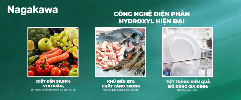 Điện phân Hydroxyl là công nghệ khử khuẩn tiên tiến hiện nay, có khả năng làm sạch thực phẩm theo cơ chế thông minh: