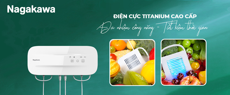 - Hai điện cực Titanium cao cấp siêu bền giúp khử khuẩn song song nhiều loại thực phẩm, tiết kiệm thời gian;