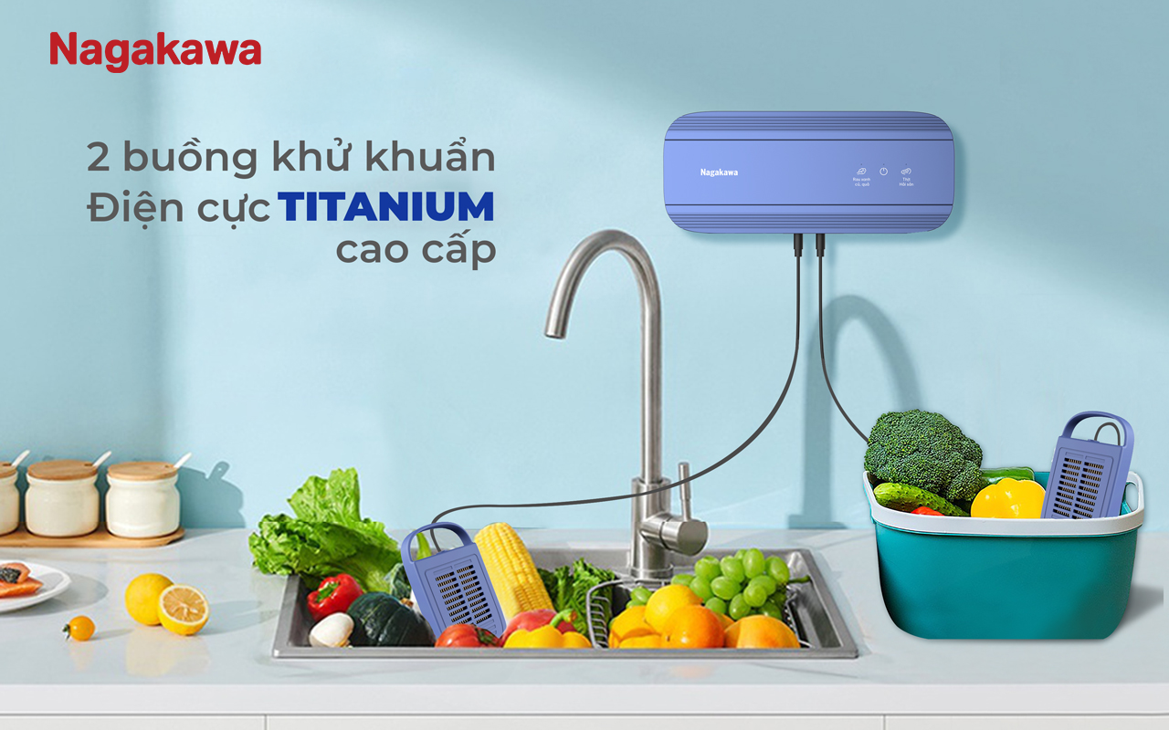 - Hai điện cực Titanium cao cấp siêu bền giúp khử khuẩn song song nhiều loại thực phẩm, tiết kiệm thời gian;