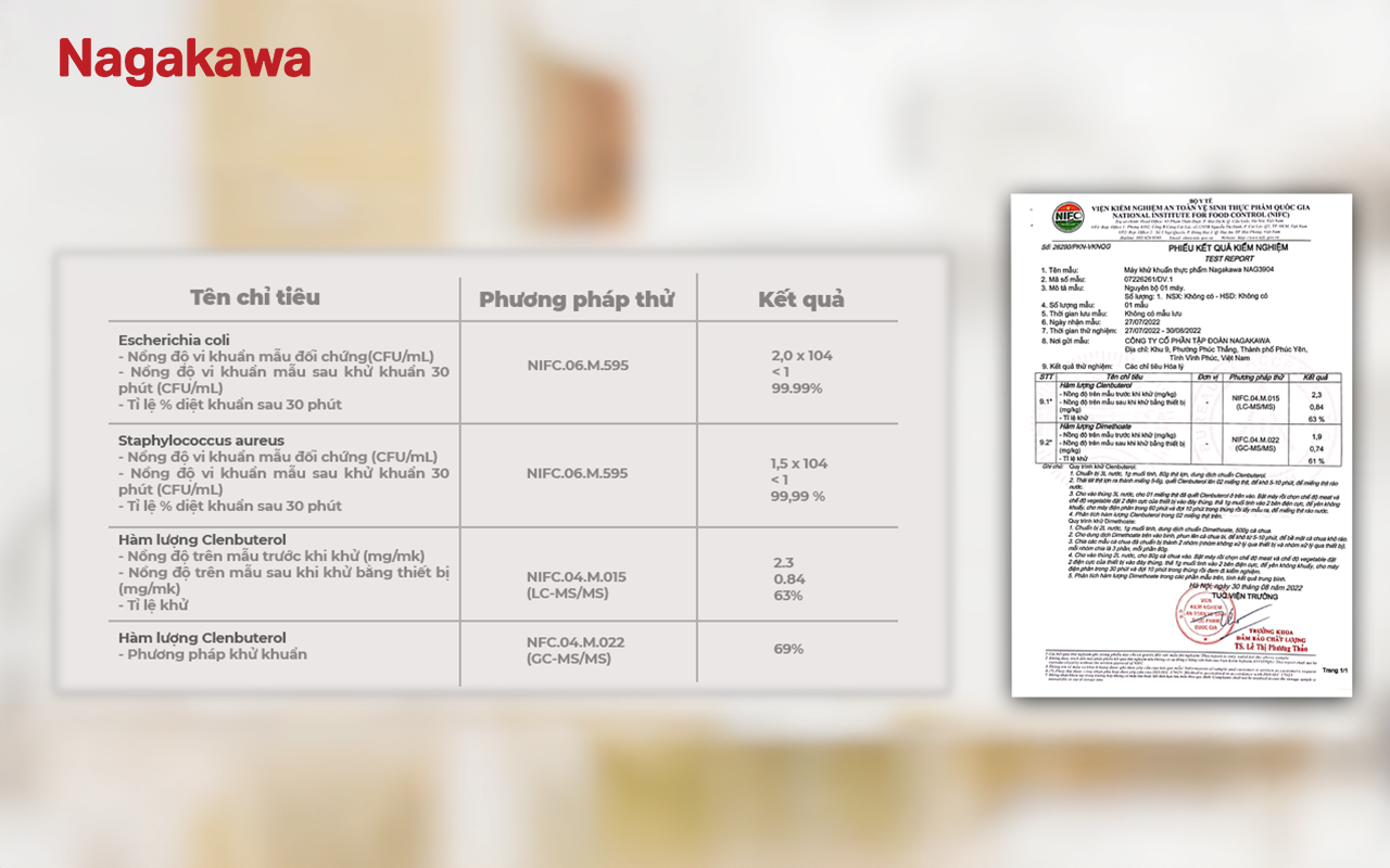 Hiệu quả khử khuẩn của sản phẩm đáp ứng các chỉ tiêu vi sinh vật và chỉ tiêu hóa lý, được kiểm định bởi Viện kiểm định an toàn và vệ sinh thực phẩm Quốc gia (Bộ y tế).