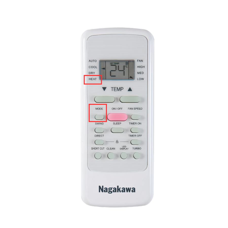 Nút “Heat” sưởi ấm trên remote thường được thiết kế riêng hoặc tích hợp trong nút “Mode”, giúp người dùng dễ dàng nhận biết máy lạnh 2 chiều