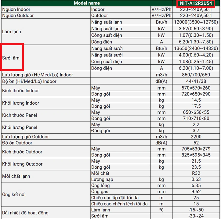 Model “NIT-A12R2U54”: Ký tự "A" có thể hiểu là All Season (dùng cho mọi mùa) hoặc Air Conditioning with Heating (máy lạnh kèm sưởi ấm), đại diện cho dòng máy lạnh 2 chiều.