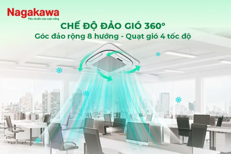 Điều hòa âm trần Cassette Inverter 8 hướng thổi NIT-A24R2U54 2 chiều làm mát và sưởi ấm nhanh do cơ chế đảo gió 360 cùng 8 hướng thổi