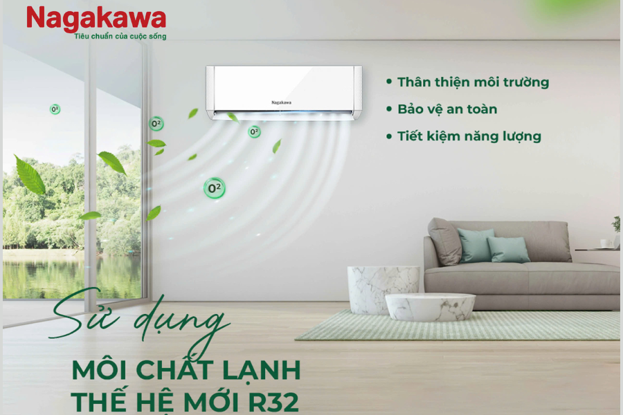 Điều hòa Nagakawa NS-C12R2B52 1 chiều làm lạnh sử dụng gas R32 có độ an toàn cao, khó cháy nổ