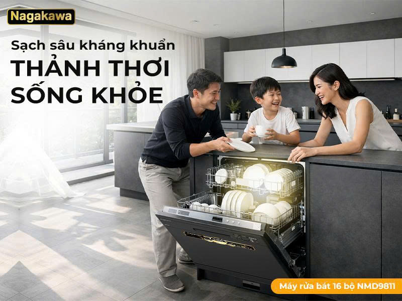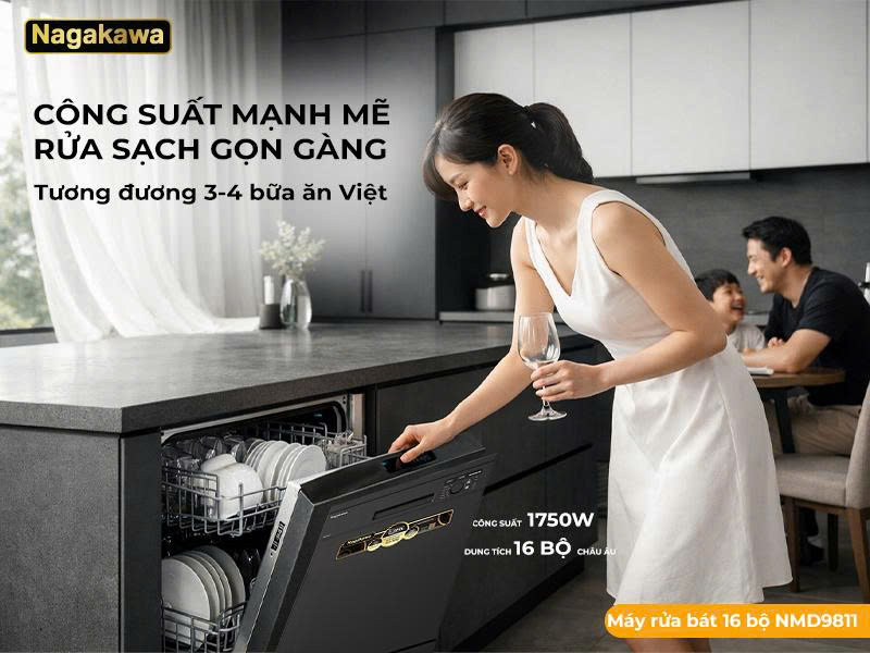 Giữa guồng quay bận rộn, một bữa cơm ngon trọn vẹn không chỉ nằm ở hương vị món ăn mà còn ở sự thảnh thơi, thư thái sau khi tàn tiệc. Máy rửa bát 16 bộ Nagakawa NMD9811 xuất hiện như một "quản gia" đắc lực cho gia đình hiện đại, giúp bạn gác lại âu lo về chồng bát đĩa ngổn ngang. Với dung tích rửa vượt trội cùng khả năng làm sạch sâu đa tầng, sản phẩm không chỉ giải phóng hoàn toàn đôi tay người nội trợ mà còn thiết lập một chuẩn mực vệ sinh mới: sạch khuẩn, khô ráo và an toàn tuyệt đối cho sức khỏe của cả gia đình.