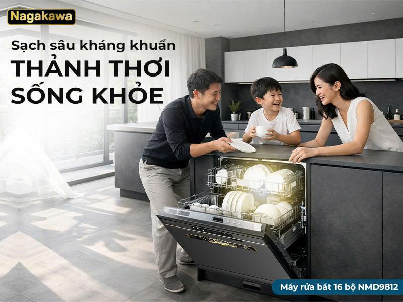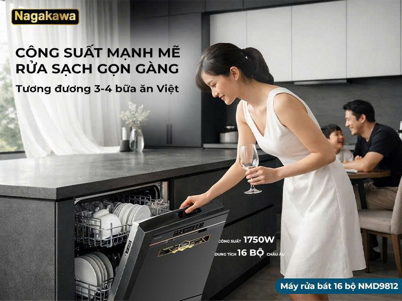 Trong nhịp sống hiện đại tất bật, thời gian dành cho gia đình là điều xa xỉ. Đừng để gánh nặng dọn dẹp sau mỗi bữa ăn chiếm lấy những phút giây thư giãn quý giá của bạn. Máy rửa bát 16 bộ Nagakawa NMD9812 với công suất mạnh mẽ và thiết kế thông minh được "đo ni đóng giày" cho căn bếp Việt, không chỉ giúp bát đĩa sạch bong, khô cong mà còn bảo vệ sức khỏe cả nhà, để việc nội trợ trở nên nhẹ nhàng và đầy cảm hứng.