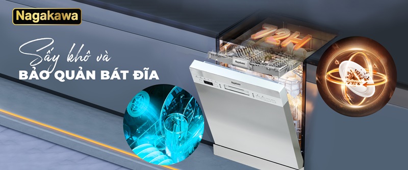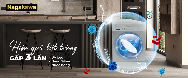 Máy rửa bát Nagakawa NK15D03M sử dụng UV LED có khả năng loại bỏ tới 99.99% vi khuẩn mà không cần sử dụng hóa chất. Công nghệ này hoạt động trên cơ chế phá hủy các liên kết DNA trong tế bào virus, vi khuẩn, nhờ đó tiêu diệt và vô hiệu hóa chúng một cách dễ dàng. Chưa dừng lại ở đó, máy được diệt khuẩn bằng NANO SILVER là công nghệ hiện đại đang được ứng dụng rộng rãi, mang lại hiệu quả triệt để và an toàn hơn. Trong mỗi máy rửa bát Nagakawa sẽ có các túi đựng Nano bạc để tiêu diệt vi khuẩn và nấm. Với nước nóng và cộng hưởng của 2 công nghệ tiên tiến diệt khuẩn, bát đĩa được tiệt trùng hiệu quả gấp 3 lần so với các sản phẩm máy rửa bát thông thường giúp bữa ăn thêm an toàn, bảo vệ sức khỏe.