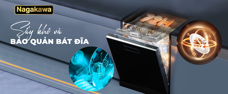 Với Máy rửa bát Nagakawa NK15D05M, bát đĩa không chỉ sạch bong sáng bóng mà còn được sấy khô an toàn.