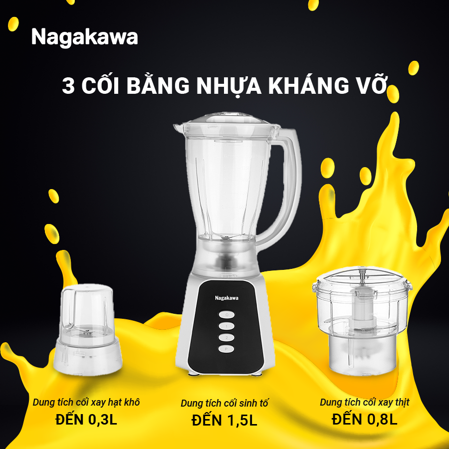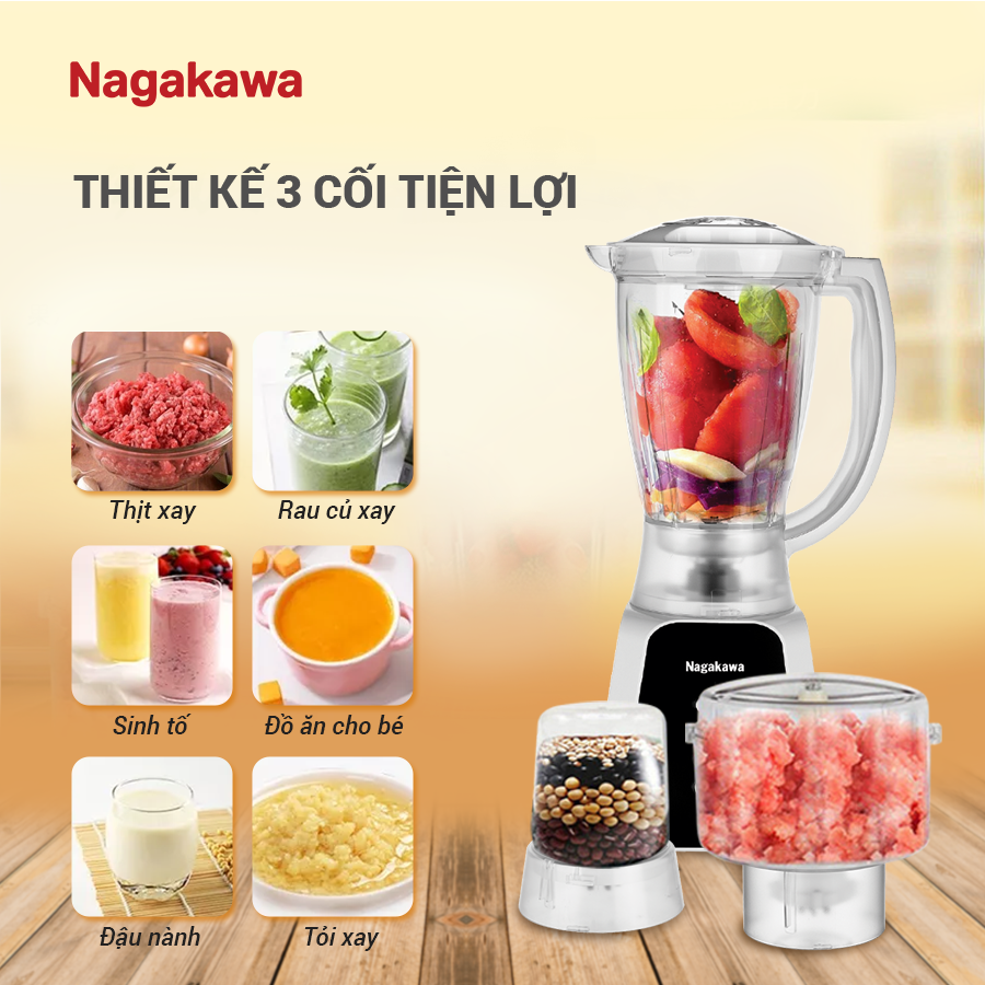 Máy xay sinh tố Nagakawa NAG0819 bao gồm 3 cối nhựa đảm nhiệm 3 chức năng là xay sinh tố, xay thịt, xay hạt khô. Chỉ cần thay đổi cối, các món ngon mới sẽ ra đời mà không cần máy xay chuyên dụng dành riêng cho từng loại thực phẩm. Tích hợp cả 3 tính năng trong cùng 1 sản phẩm giúp tiết kiệm chi phí mua sắm đồ gia dụng, tối ưu không gian lưu trữ, đặc biệt hữu ích với các căn bếp nhỏ.