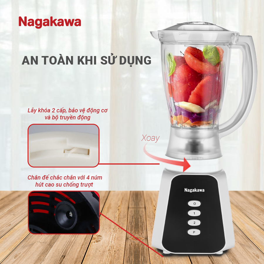 Máy xay sinh tố Nagakawa NAG0819 có chốt an toàn, chỉ hoạt động khi các bộ phận đã được lắp đặt chính xác. Khi lắp ráp chưa đúng, máy sẽ không hoạt động để bảo vệ máy, tránh làm hỏng bánh răng nối giữ cối xay và thân máy.
