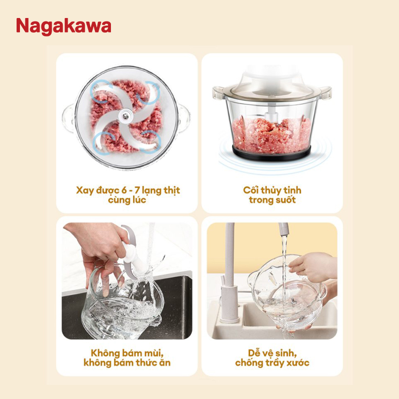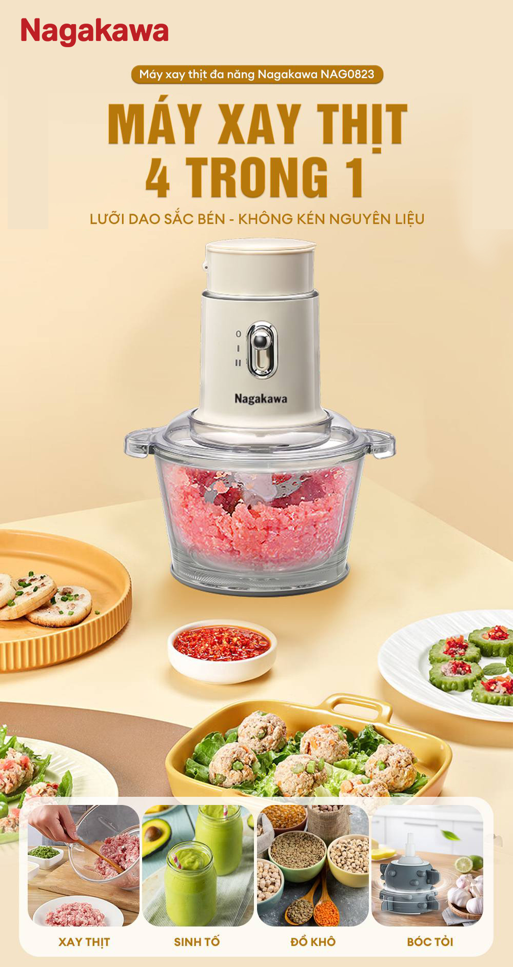 Để tạo nên những món ăn ngon, quá trình nấu nướng có thật nhiều công việc nhỏ nhặt, đó có thể là xay thịt, xay sinh tố, xay đồ khô, hay bóc tỏi. Hiểu được sự vất vả của người nội trợ, Nagakawa cho ra đời máy xay thịt đa năng Nagakawa NAG0823. Sản phẩm tích hợp nhiều công năng giúp tiết kiệm thời gian nấu nướng và tối ưu đồ gia dụng trong bếp.