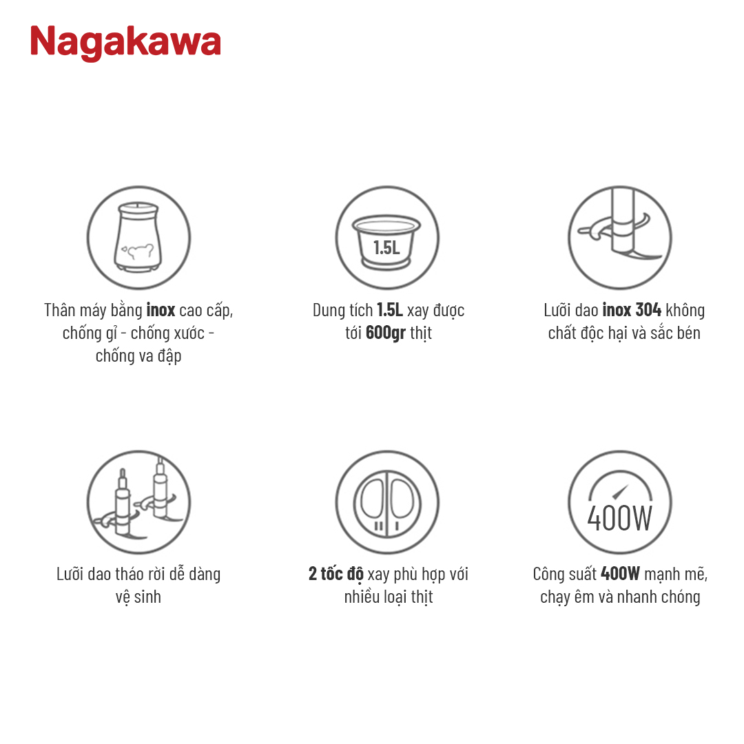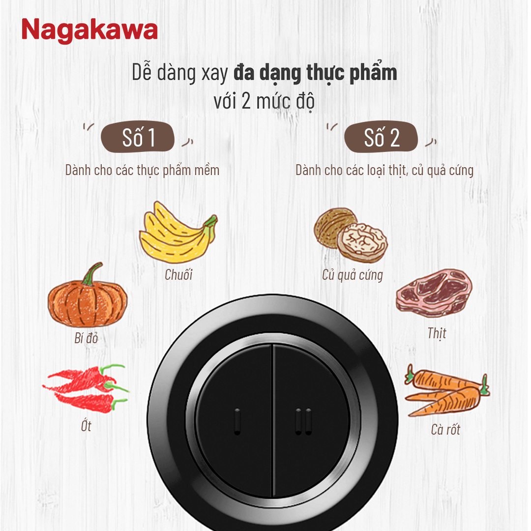 Với công suất lên đến 400W với 2 mức điều chỉnh tốc độ, máy xay thịt Nagakawa NAG0812 dễ dàng xay các loại thịt khác nhau, ngoài ra còn xay được các loại gia vị, rau củ, trái cây… chỉ trong vài giây, giúp công việc nội trợ của bạn trở nên dễ dàng và thuận tiện hơn.
