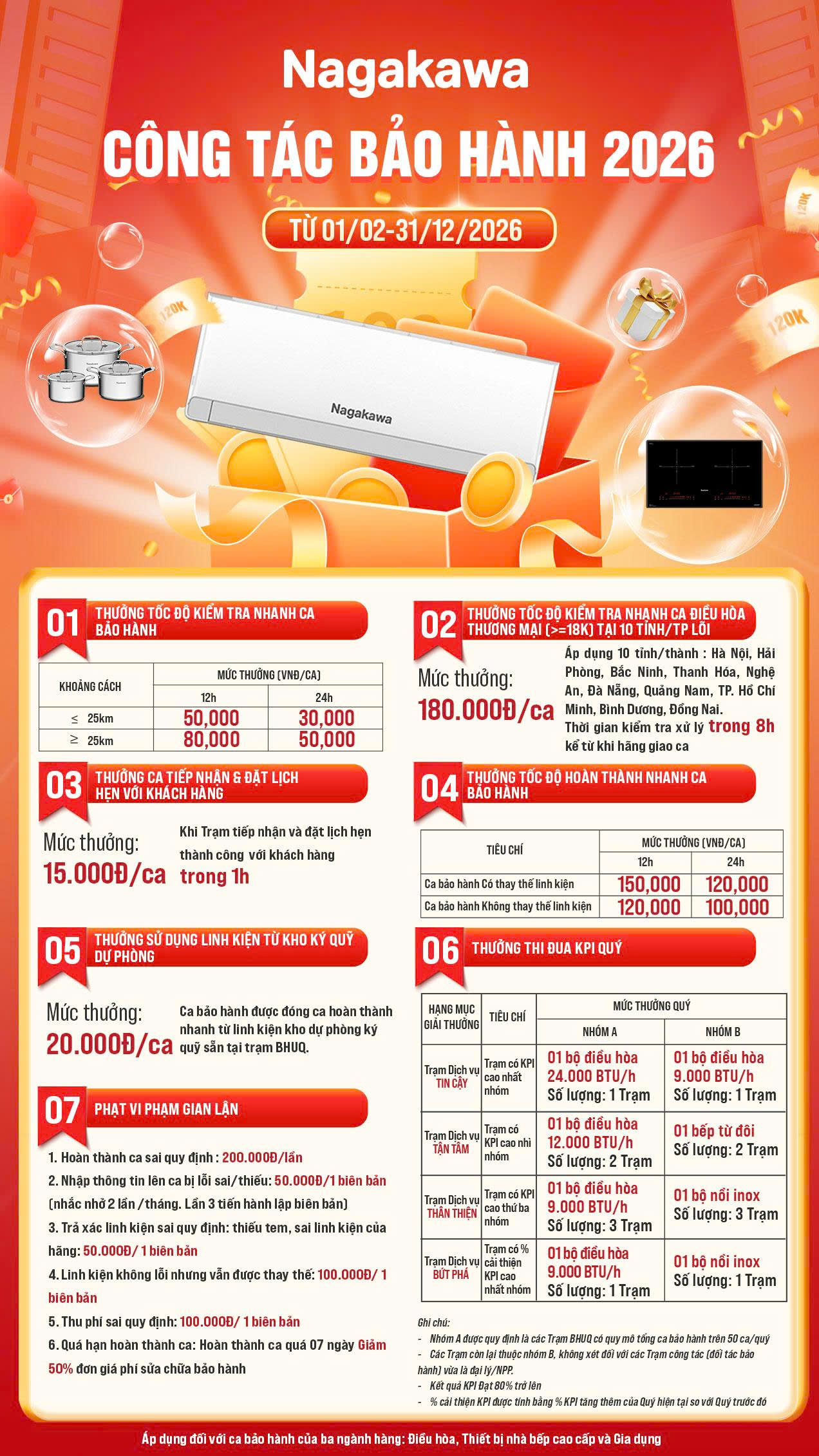 Từ ngày 01/02 đến 31/12/2026, Nagakawa chính thức triển khai Công tác Bảo hành 2026 trên phạm vi toàn quốc. Chương trình được xây dựng nhằm chuẩn hóa tốc độ xử lý, nâng cao chất lượng dịch vụ hậu mãi và tạo động lực thi đua cho hệ thống Đại lý, Nhà phân phối và Trạm Bảo hành Ủy quyền, qua đó khẳng định cam kết của Nagakawa trong việc mang đến trải nghiệm dịch vụ ngày càng chuyên nghiệp và hiệu quả cho khách hàng.