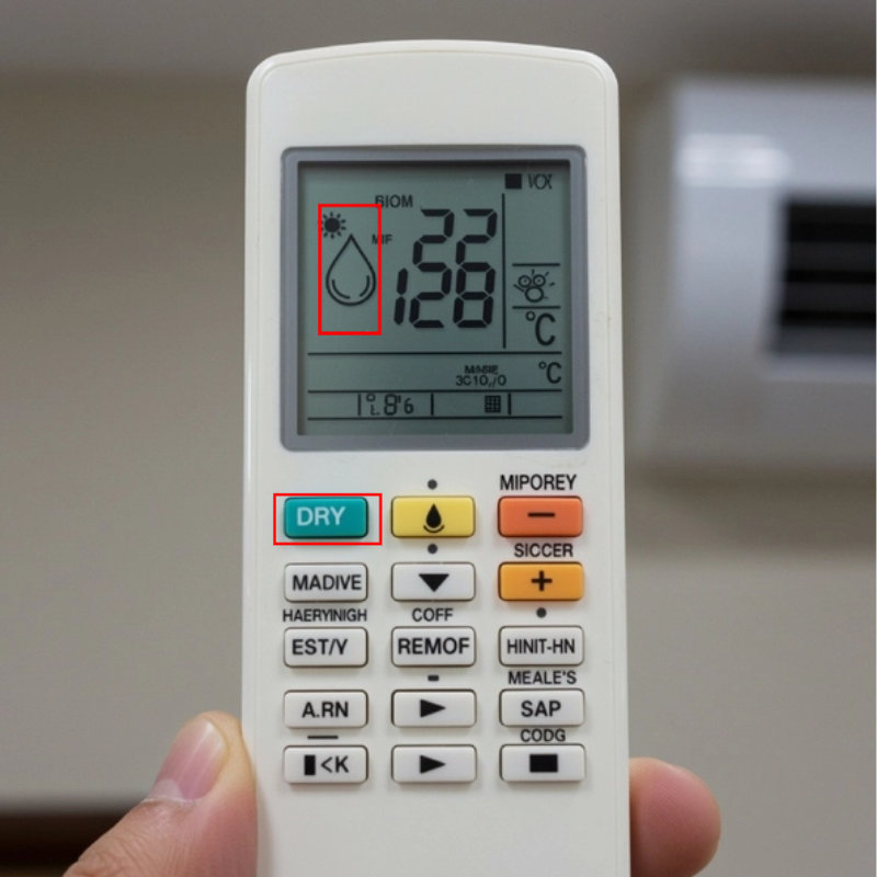Chọn chế độ Dry (biểu tượng giọt nước) trên điều khiển điều hòa..