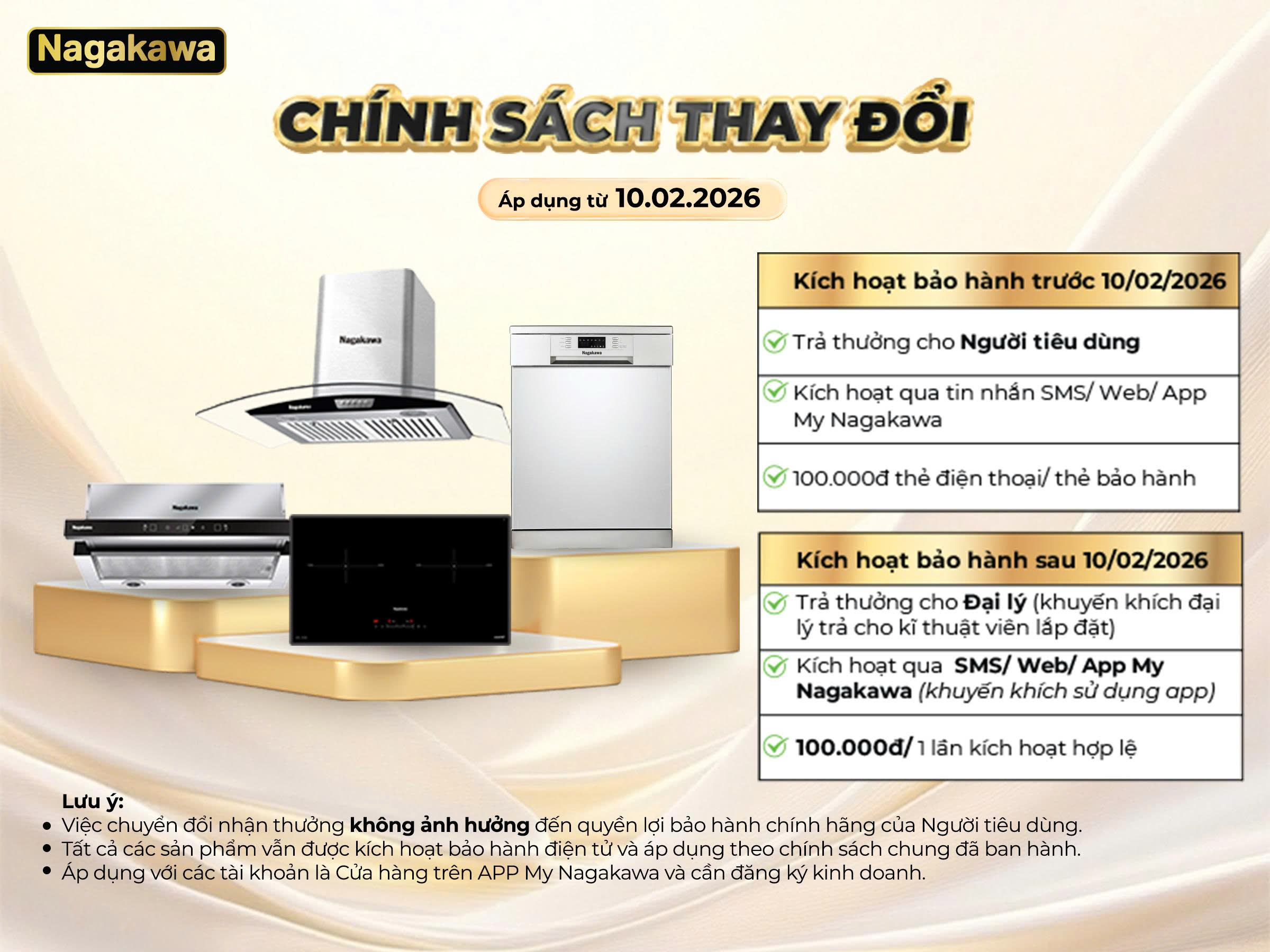 Nhằm tối ưu quy trình vận hành, đồng thời nâng cao hiệu quả triển khai chính sách bảo hành điện tử của các sản phẩm thiết bị nhà bếp cao cấp trên toàn hệ thống, Nagakawa trân trọng thông báo đến Quý Khách hàng và Quý Đại lý về việc điều chỉnh chương trình trả thưởng khi kích hoạt bảo hành điện tử kể từ ngày 10/02/2026 cụ thể như sau: