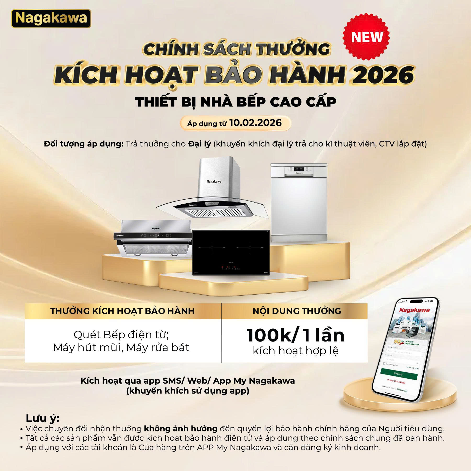 Từ ngày 10/02/2026, nhằm ghi nhận và gia tăng quyền lợi cho Quý Đại lý, Nhà phân phối và đội ngũ kỹ thuật viên, Nagakawa triển khai chính sách trả thưởng trực tiếp cho Đại lý khi thực hiện kích hoạt bảo hành điện tử.
