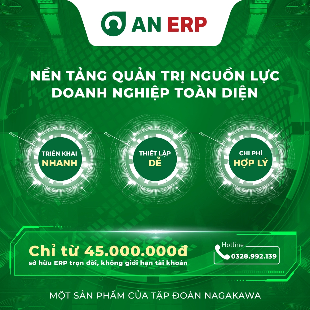 Thấu hiểu nhu cầu của doanh nghiệp Việt trên hành trình chuyển đổi số, Nagakawa đã phát triển AN ERP – phần mềm quản trị nguồn lực doanh nghiệp, giải pháp chuyển đổi số toàn diện với 3 tiêu chí: triển khai nhanh, thiết lập dễ dàng và chi phí hợp lý. An ERP sẽ giúp các Doanh nghiệp có thể tham gia ngay vào làn sóng chuyển đổi số quốc gia để nâng cao năng lực cạnh tranh và phát triển trong thời đại mới.