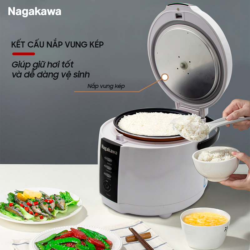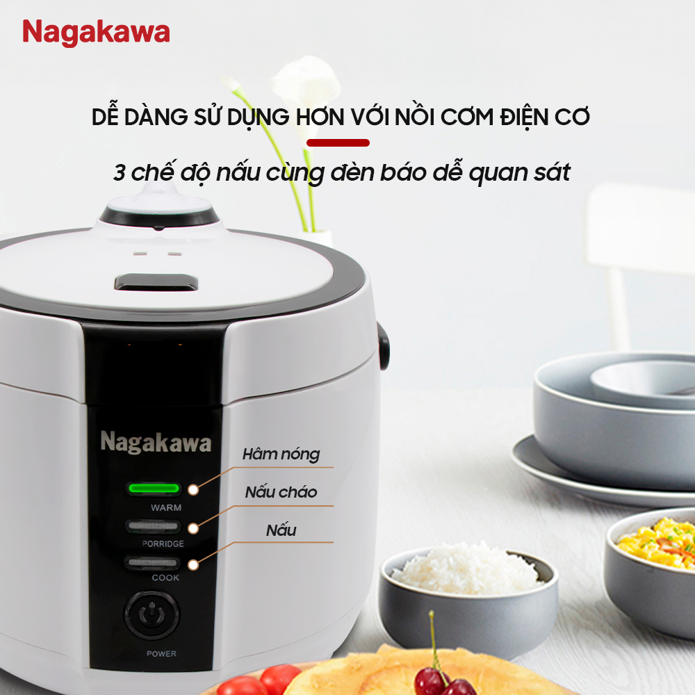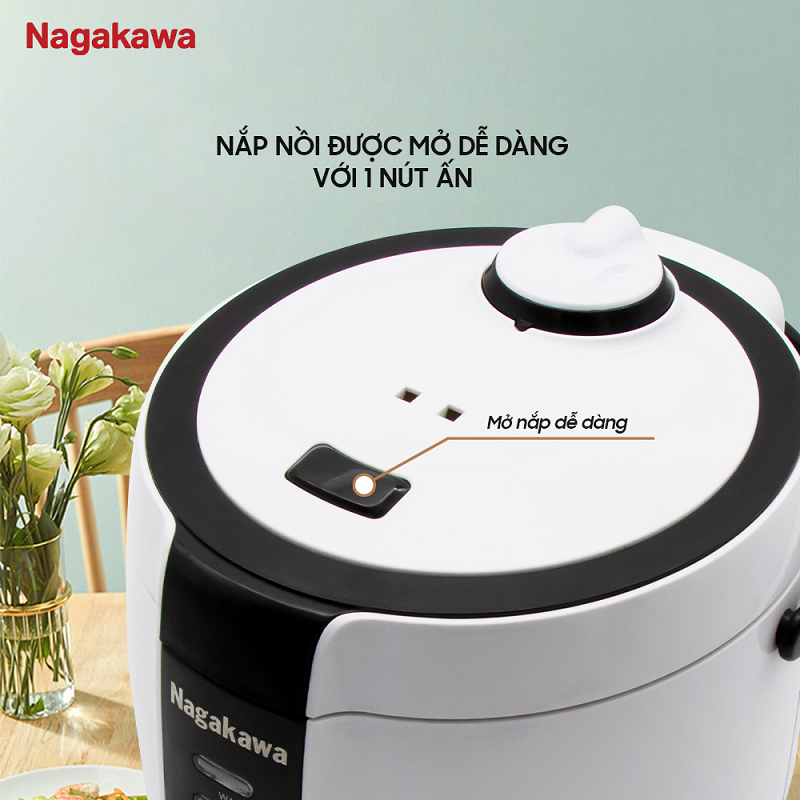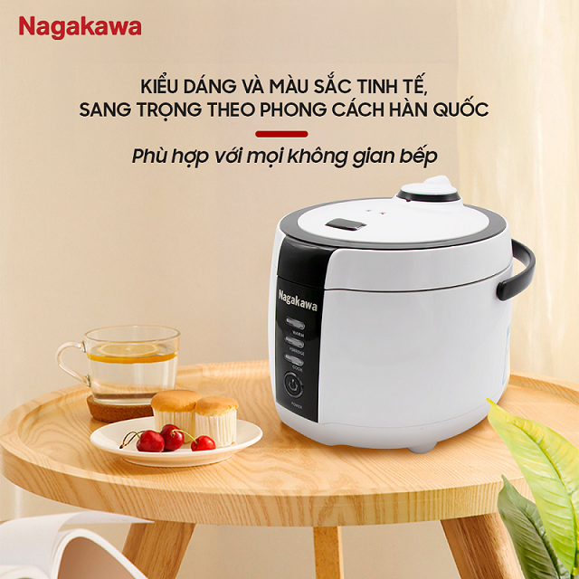 Nồi cơm điện tử Nagakawa NAG0131 với thiết kế gọn đẹp sang trọng cùng màu sắc trắng đen nhã nhặn mang đến điểm nhấn cho căn bếp nhà bạn.