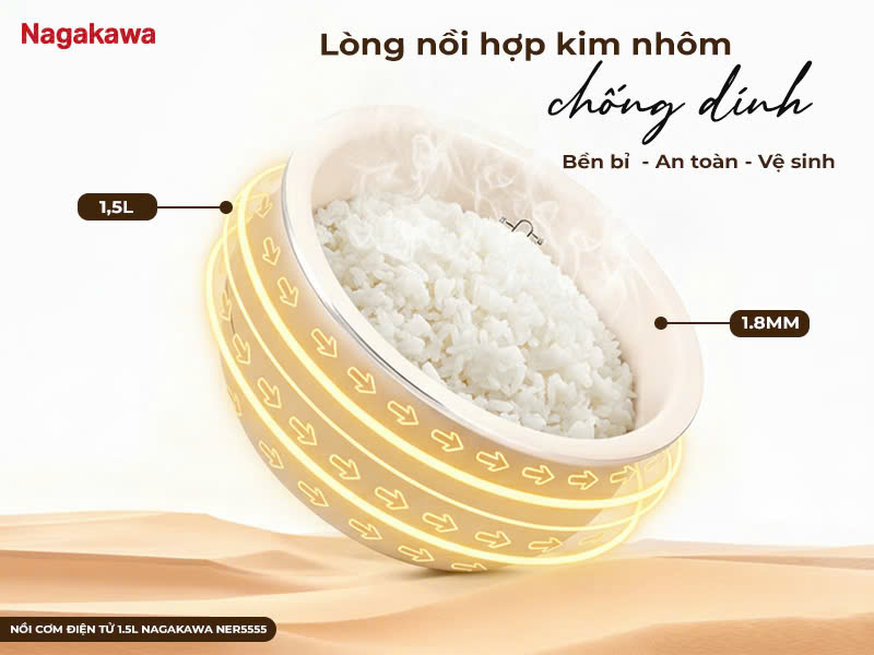 Nồi cơm điện tử 1.5L Nagakawa NER5555 sử dụng lòng nồi niêu hợp kim nhôm phủ chống dính, dày 1.8 mm, cho khả năng giữ nhiệt lâu và truyền nhiệt đồng đều. Nhờ đó, cơm luôn tơi xốp, dẻo và giữ được hương vị tự nhiên. Lớp chống dính chất lượng cao giúp xới cơm dễ dàng và vệ sinh nhanh gọn sau mỗi lần sử dụng.