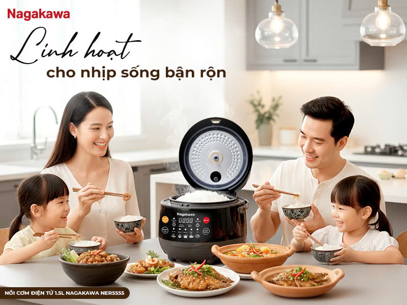 Trong những gia đình 5–7 người có lối sống bận rộn nhưng vẫn yêu thích sự tiện lợi, một chiếc nồi cơm điện tử đa năng không chỉ để nấu cơm, mà còn phải linh hoạt trong nhiều món ăn khác nhau. Nồi cơm điện tử 1.5L Nagakawa NER5555 được thiết kế cho đúng nhu cầu ấy: công nghệ nấu hiện đại, chương trình đa dạng, thao tác cảm ứng và nhiều tiện ích thông minh giúp việc nấu nướng mỗi ngày trở nên nhẹ nhàng, chủ động và thú vị hơn.