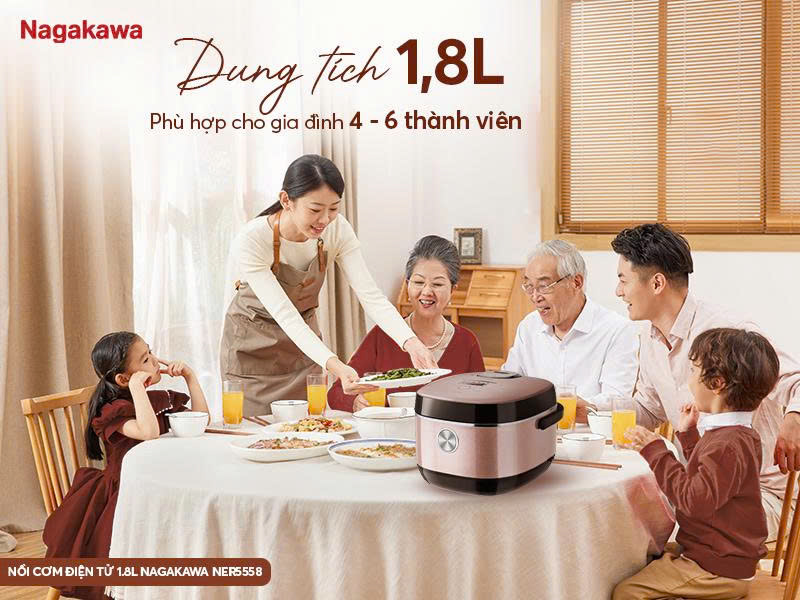 Một bữa cơm ngon cho cả gia đình đến từ những hạt cơm dẻo, thơm và đủ đầy. Nồi cơm điện tử Nagakawa NER5558 dung tích 1.8L chính là “trợ thủ” giúp việc nấu nướng trở nên nhanh chóng và dễ dàng hơn bao giờ hết. Cơm chín đều, giữ ấm lâu sẵn sàng phục vụ mọi bữa ăn, từ bữa sáng vội vàng đến bữa tối sum họp.