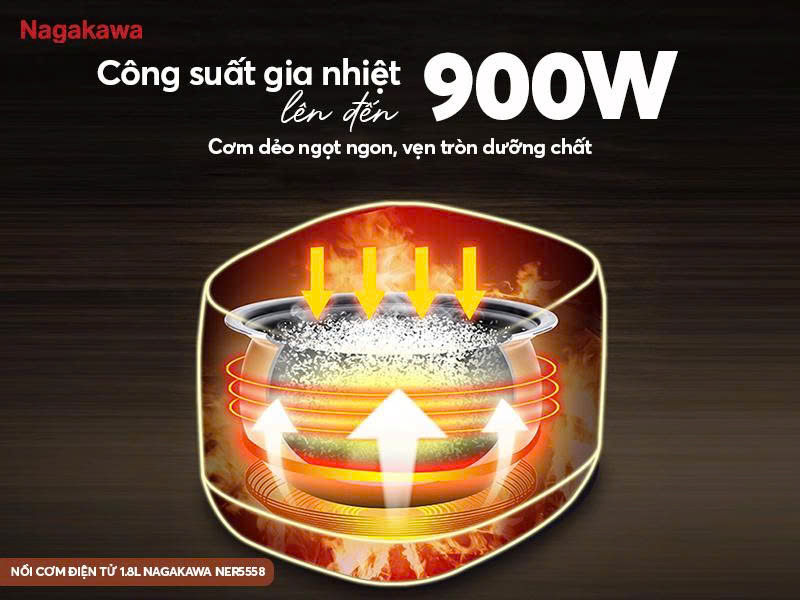 Sở hữu công suất gia nhiệt 900W, nồi cơm điện Nagakawa NER5558 có lượng nhiệt mạnh mẽ và ổn định, giúp cơm chín đều từ trong ra ngoài, hạt cơm mềm dẻo, thơm ngon tự nhiên. Công suất cao còn rút ngắn thời gian nấu, giúp tiết kiệm năng lượng. Với thiết kế thông minh và hiệu suất nấu tối ưu, sản phẩm NER5558 là trợ thủ đắc lực cho mọi bữa cơm ngon, nhanh và gọn.