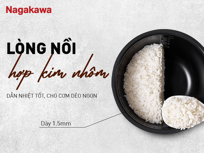 - Lòng nồi hợp kim nhôm dày 1.5mm giúp cơm chín ngon.