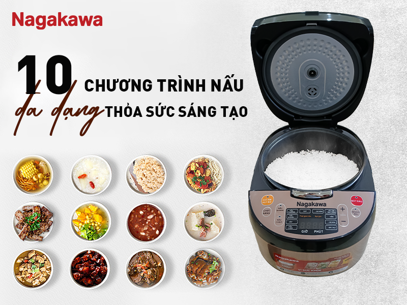 Điểm nổi bật của Nagakawa NER5556 chính là tích hợp 10 chương trình nấu tự động, cho phép bạn chế biến đa dạng các món ăn ngon miệng. Từ cơm trắng dẻo thơm, xôi, cháo, súp, đến các món hấp, hầm, nấu chậm,... tất cả đều trở nên dễ dàng hơn bao giờ hết. Đặc biệt, với các chế độ nấu dành riêng cho người già và trẻ em, Nagakawa NER5556 chăm sóc sức khỏe cho cả gia đình bạn.
