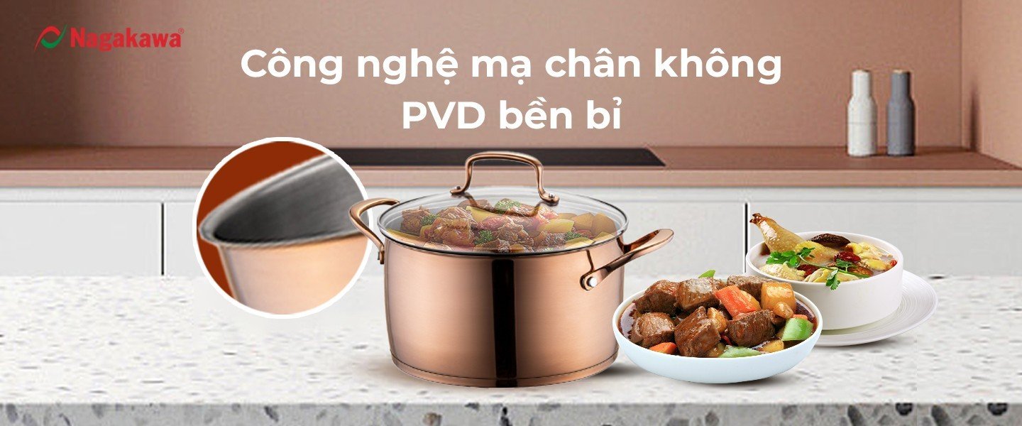 Đây là công nghệ mạ chân không đòi hỏi kỹ thuật cao được ứng dụng rộng rãi trong công nghiệp mạ đồng hồ, trang sức, nội thất cao cấp… vừa giúp sản phẩm tăng độ bền lên gấp 2-3 lần vừa mang lại tính thẩm mĩ cao. Ngoài ra, công nghệ mạ PVD giúp cho lớp phủ vững chắc không bong tróc, giữ cho sản phẩm sáng bóng sau thời gian dài sử dụng. Lớp mạ vàng đã giúp nồi inox 304 đáy từ NAG1358-24 tạo nên một xu hướng mới mẻ trong căn bếp - đó là sự sang trọng, cao cấp và ấn tượng.
