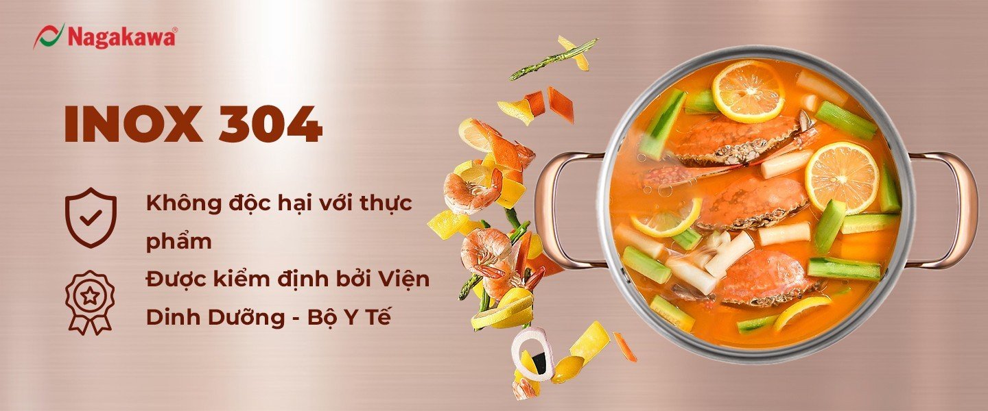 - Inox 304 vệ sinh an toàn thực phẩm, được kiểm định bởi Viện Dinh Dưỡng - Bộ Y Tế