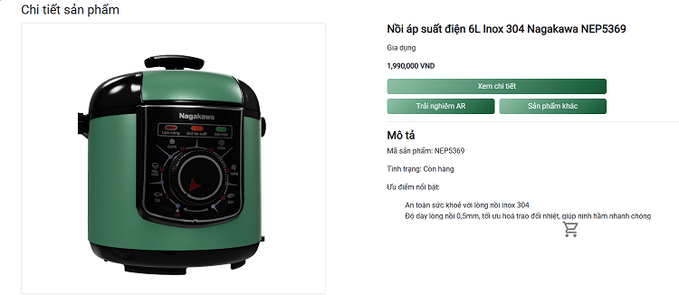 Khác với những showroom ảo đơn thuần chỉ để ngắm nhìn, Showroom 3D Nagakawa mang đến trải nghiệm tương tác tối ưu, giúp người dùng thực sự “sống thử” cùng sản phẩm. Mỗi thiết bị được trưng bày đều tích hợp đầy đủ thông tin cần thiết, từ thông số kỹ thuật, tính năng nổi bật đến catalogue điện tử, cho phép khách hàng dễ dàng tham khảo mà không cần rời khỏi màn hình. Không chỉ vậy, hệ thống hình ảnh 360° cho phép xoay, phóng to, thu nhỏ và quan sát chi tiết từng góc cạnh sản phẩm một cách chân thực. Đặc biệt, công nghệ AR được áp dụng giúp người dùng có thể xem toàn bộ sản phẩm dưới nhiều góc nhìn khác nhau ngay trong không gian ảo, tạo cảm giác như đang trực tiếp đứng trước sản phẩm thật. Tất cả những yếu tố này kết hợp lại biến hành trình khám phá showroom trở thành một trải nghiệm sống động, trực quan và tiện lợi hơn bao giờ hết.