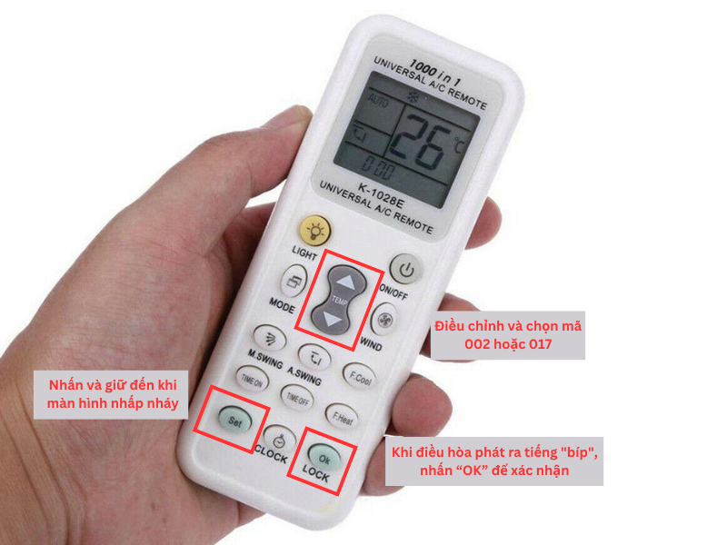 Khi điều hòa phát ra tiếng “bíp”, ngay lập tức nhấn “OK” để lưu mã tìm thấy.