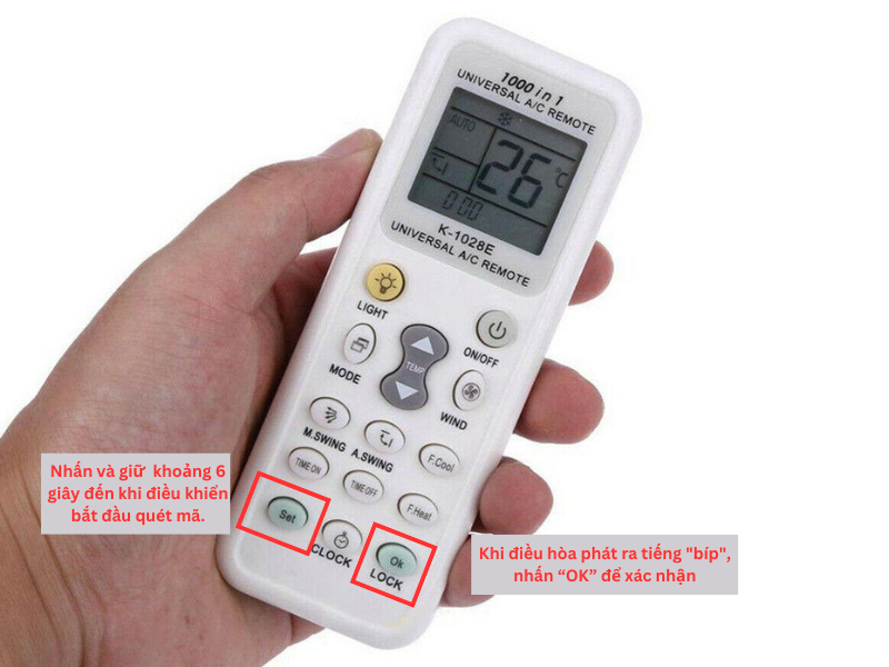 Nhấn và giữ nút “SET” khoảng 6 giây đến khi điều khiển bắt đầu quét mã.