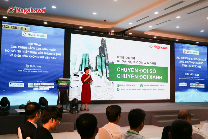 Trong hành trình ứng dụng Khoa học công nghệ, dùng chuyển đổi số để chuyển đổi xanh của mình, Nagakawa còn phối hợp với các đối tác công nghệ lớn trong nước và trên thế giới để xây dựng giải pháp Smart VRF/HVA/BSSS. Đây là giải pháp đưa máy VRF Nagakawa kết nối với hệ thống điều khiển thông minh của tòa nhà để có thể quản lý, giám sát và cảnh báo việc sử dụng năng lượng lãng phí. Hiểu một cách khác, Nagakawa không chỉ cung cấp điều hòa VRF/HVAC thông thường mà còn tham gia liên minh xây dựng hệ thống công nghệ tổng thể gồm công nghệ phần mềm, công nghệ truyền số liệu viễn thông tiên tiến (4G, 5G), công nghệ AI, IoT, công nghệ phân tích dữ liệu để đưa ra giải pháp có khả năng quản lý năng lượng tiêu thụ tòa nhà, từ đó giảm được tới 25% năng lượng tiêu thụ và giảm thiểu khí phát thải nhà kính. Đây cũng là một trong những chiến lược lớn để đưa Nagakawa chuyển dịch sang hướng công nghệ trong lĩnh vực Lạnh và điều hòa không khí, góp phần đem tới cho thị trường những sản phẩm điều hòa không khí đạt tiêu chuẩn, bền vượt trội, tiết kiệm điện năng và giảm tối đa tác động có hại tới môi trường. Bà Châu cũng nhấn mạnh, các doanh nghiệp điện lạnh cần chung tay để đồng hành cùng Chính phủ hướng đến mục tiêu Net Zero, cùng Chuyển đổi Xanh để Phát triển bền vững.